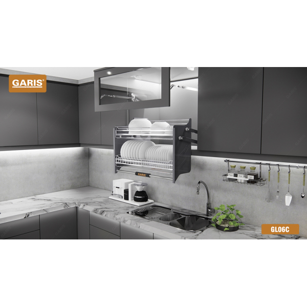 Cũng giống như giá bát đĩa nâng hạ GL06.E, GIÁ BÁT ĐĨA NÂNG HẠ NAN VUÔNG GARIS GL06.C có cấu tạo từ inox 304 theo tiêu chuẩn Nhật Bản. Đặc biệt bề mặt thanh nan được mạ chrome 5 lớp nên có độ bền rất cao và mẫu mã vô cùng bắt mắt. Được thiết kế 2 tầng thông thoáng có 2 tầng đựng bát đĩa riêng biệt song song với đó là 2 khay đựng nước tại mỗi tầng. Ngoài ra giá bát cũng có thiết kế giảm chấn thông minh và 2 nút trợ lực một cách linh hoạt.