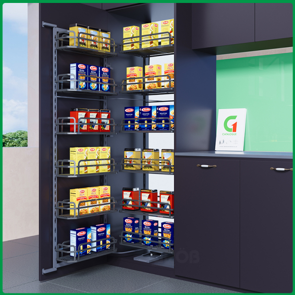 Kệ được thiết kế nhiều tầng với kích thước linh hoạt, phù hợp để lưu trữ các loại đồ khô như gia vị, mì gói, và đồ hộp, giúp tiết kiệm không gian tối đa.
