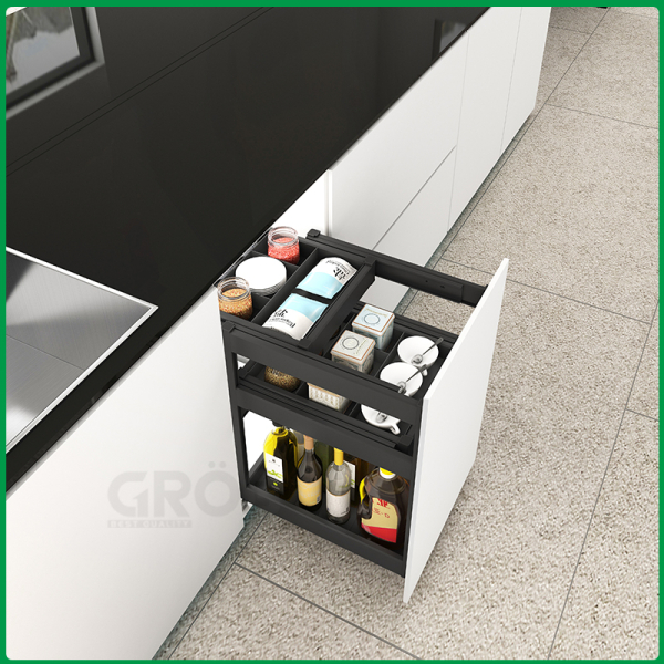 - Thiết kế gồm nhiều tầng, có thể đựng được cả chai lọ gia vị có kích thước và chiều cao khác nhau.