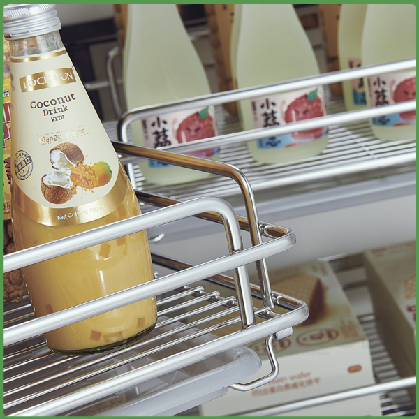 Ray trượt giảm chấn êm ái: Kệ góc liên hoàn trang bị ray trượt giảm chấn giúp kéo ra và đẩy vào nhẹ nhàng, không gây tiếng ồn và bảo vệ tủ bếp.