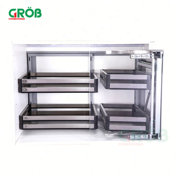 Sản phẩm được thiết kế gồm 2 khoang chứa với 4 khay để đồ rộng rãi được gắn với cánh tủ di chuyển theo giúp lấy đồ dễ dàng và tiện lợi hơn phù hợp với góc chết trong không gian bếp.