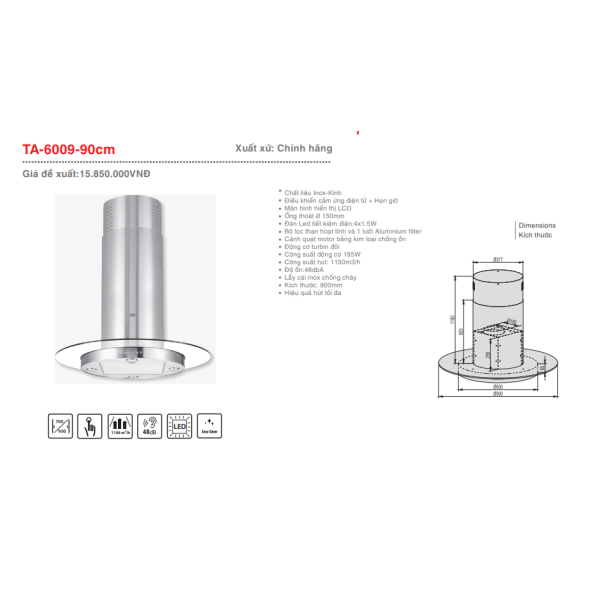 Máy hút mùi Lorca TA-6009-90 - Kích thước lắp đặt sản phẩm